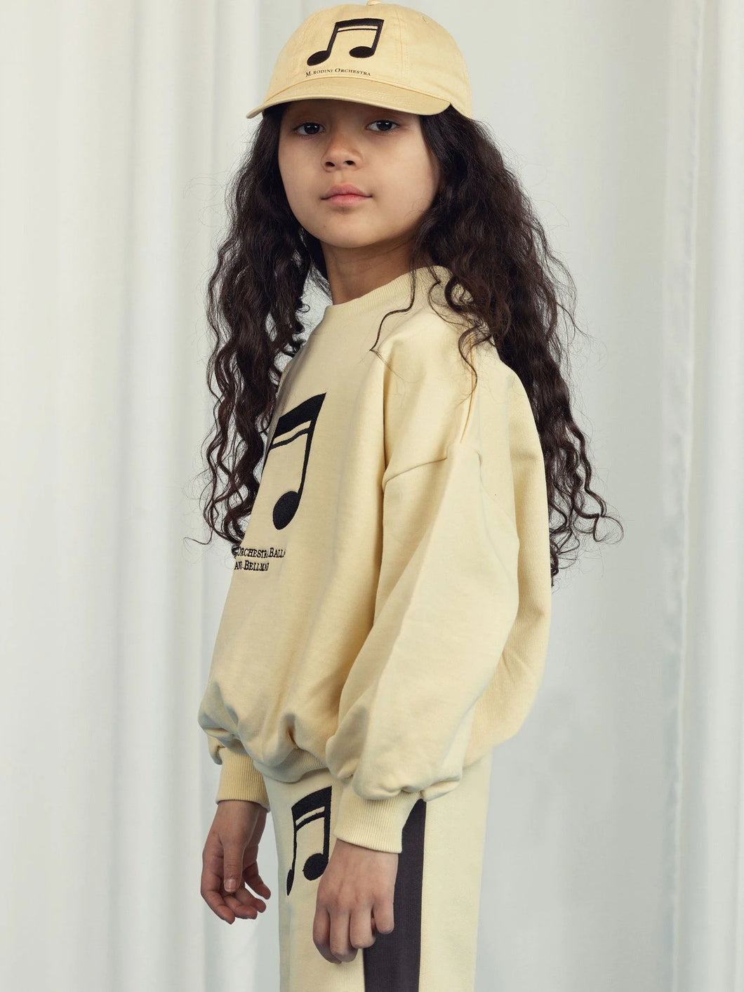 Yellow sweatshirt made in 100 % GOTS-Certified organic cotton. Designed in a relaxed fit and with ribbed trims. Decorated with a big Note patch. Snap buttons at shoulder in sizes 56/62–68/74 for easy dressing.