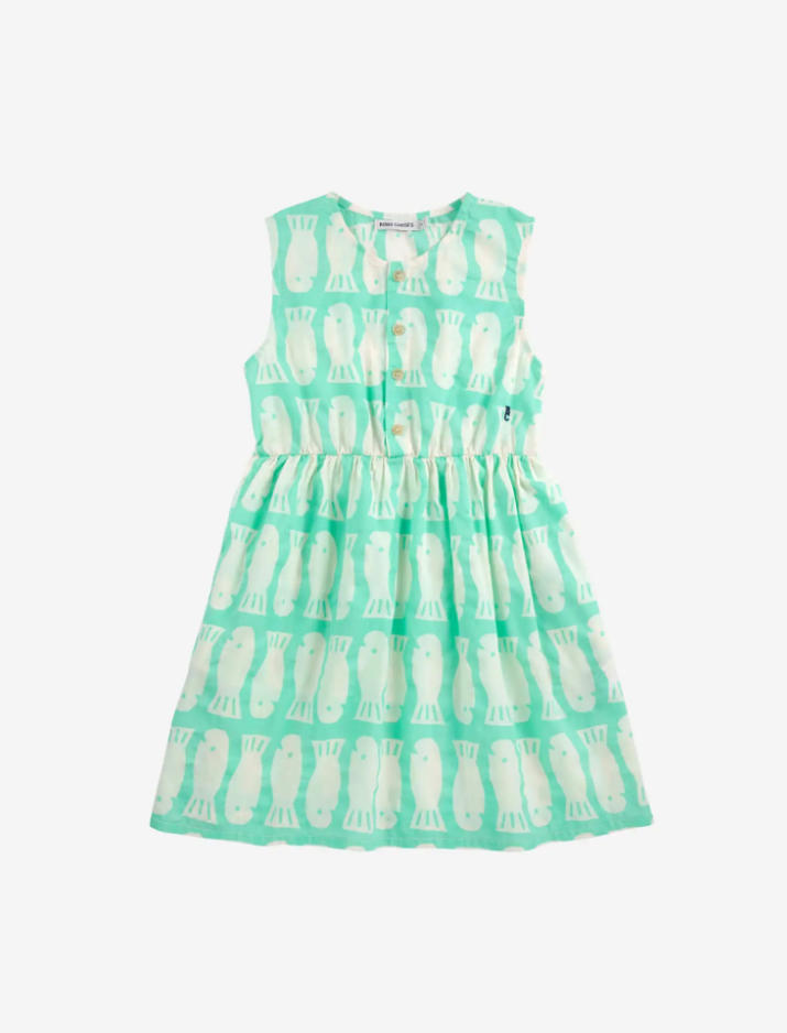 Soft and playful, this light green dress is designed for effortless elegance. Made from 100% organic cotton, it features a sleeveless design, front button fastening, and gathering details. Embroidery, an evasé fit, and a short length with a round neck complete its summer-ready look. Made in Spain.
